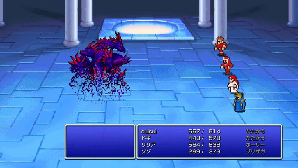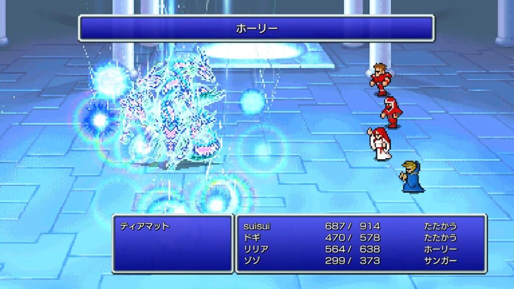 ナイト(suisui)、忍者(ドギ)は通常攻撃で様子見。黒魔導士(ゾゾ)は炎系、冷気系、雷系の魔法を1回ずつ使って1番ダメージが入った魔法を繰り返し使います。白魔導士は新しく覚えておいた「ホーリー」という光攻撃魔法を使ってみましょう♪