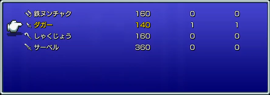 武器は、黒魔術士に”ダガー”、シーフに”サーベル”を。