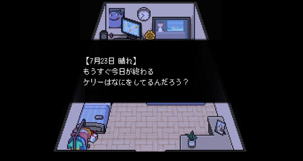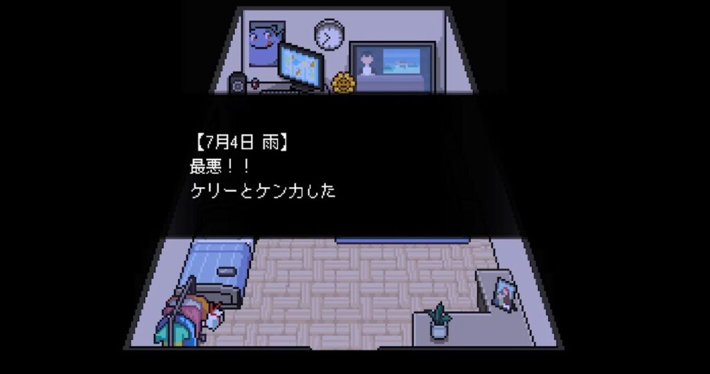 まずは部屋の中を一通り散策です。すると、彼の日記を発見!「ケリー」という友達(?)とケンカをしたことがわかりました。少年はかなり怒っていたようで、ケリーが謝ってくるまでこちらからは謝らないと書いてあります。